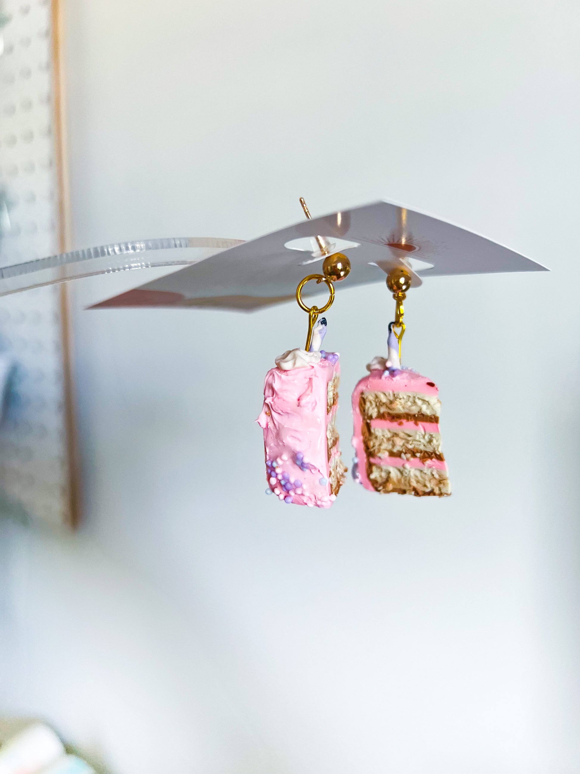 Made with polymer clay, brass, and gold plated surgical steel