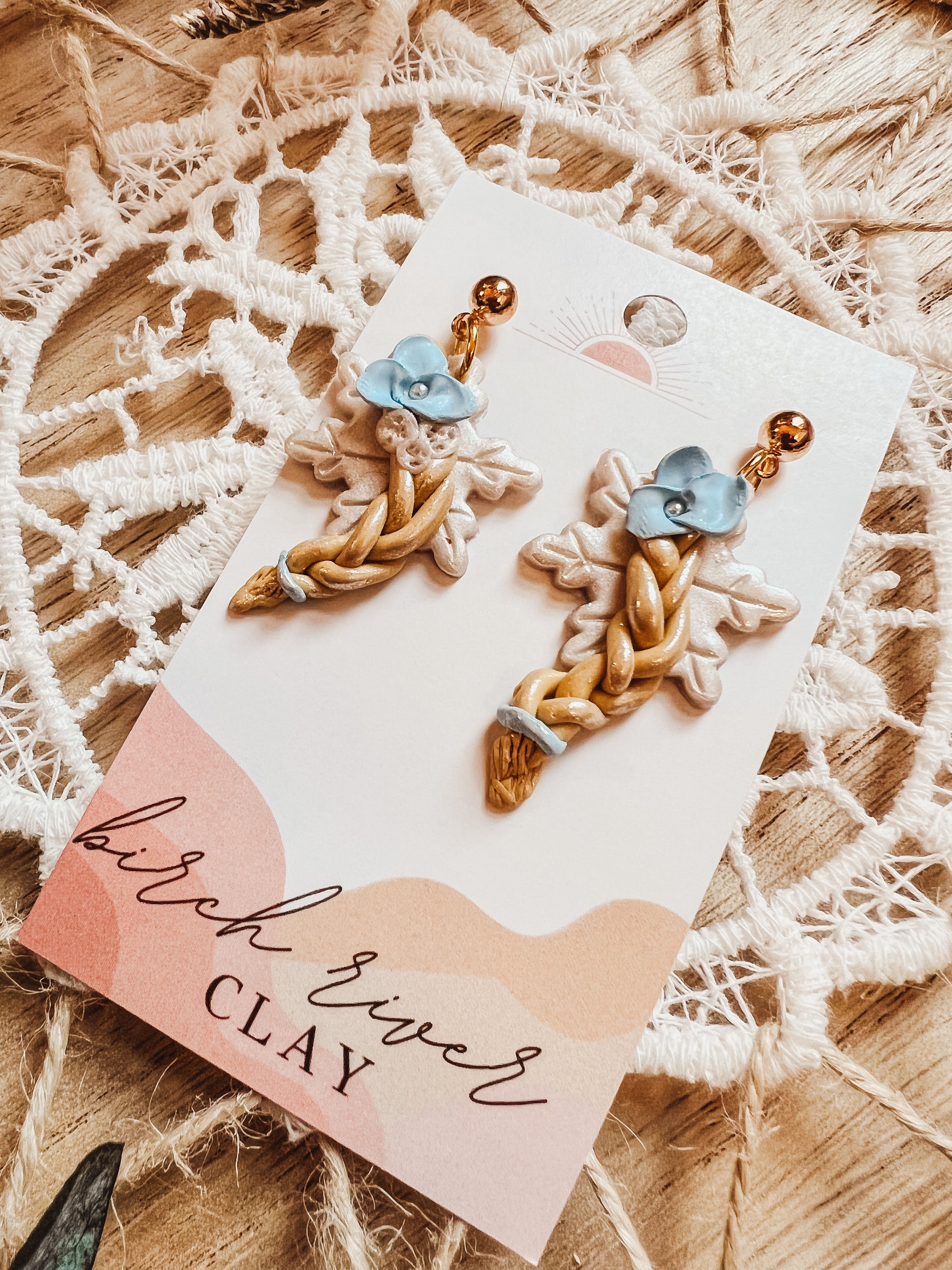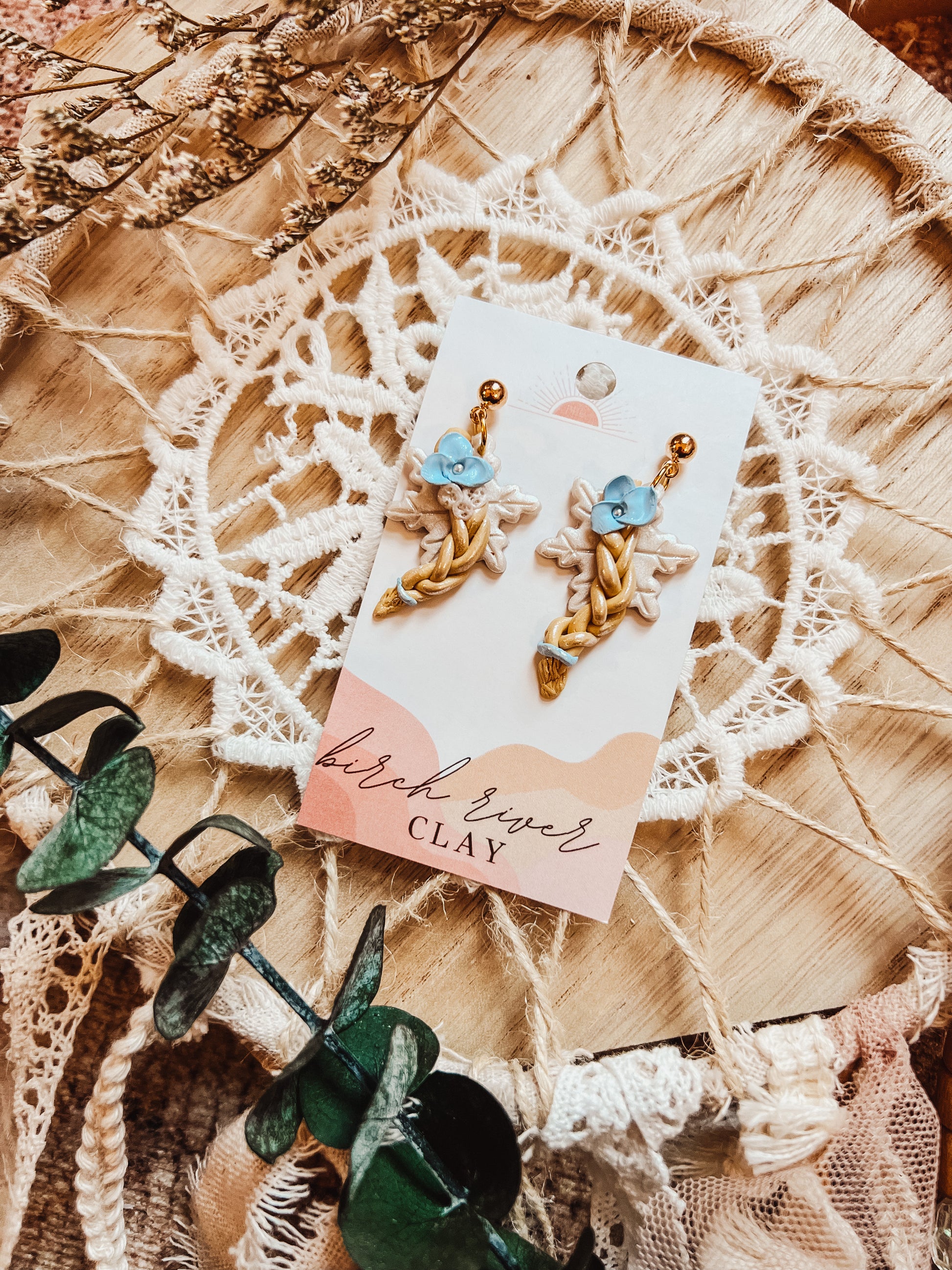 Designed and hand crafted in my Georgia studio using clay and brass- these lightweight earrings are custom pigmented, hand cut, baked, drilled, sanded, finished, and assembled with so much love. Made with polymer clay, brass, and gold-plated surgical steel.